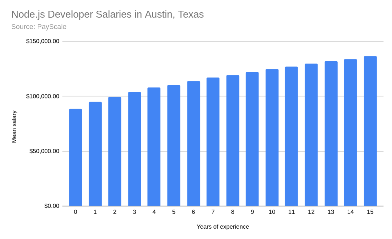 According to Stack Overflow, Node.js developers earn between $83,000 for those starting out to $115,000 for those with 15 years of experience.